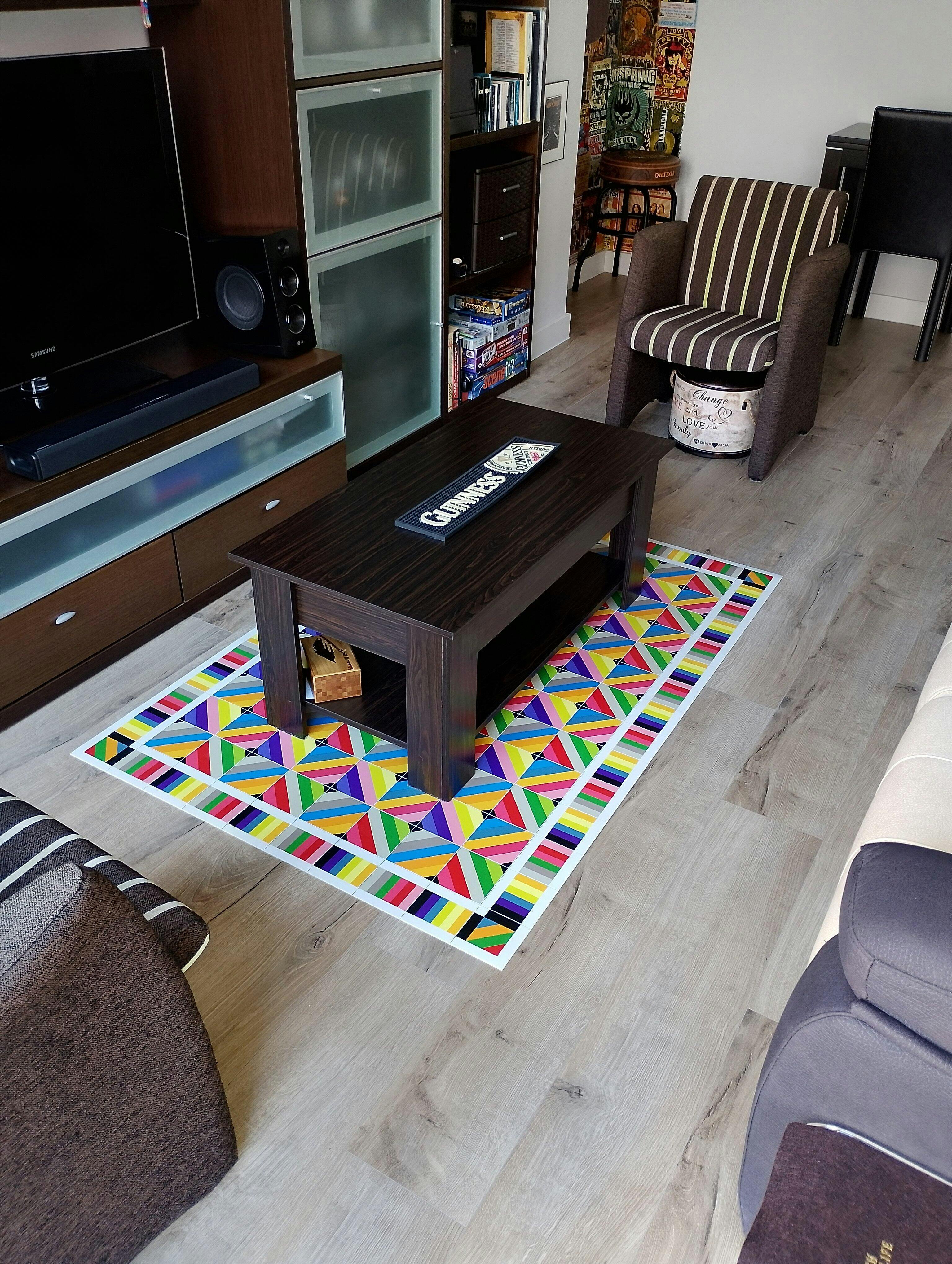 Alfombra vinílica Tamarit, ¿te atreves con esta alfombra multicolor?, no deja indiferente a nadie.